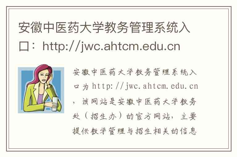 安徽中医药大学教务管理系统入口为 http://jwc.ahtcm.edu.cn,该网站是安徽中医药大学教务处(招生办)的官方网站,主要提供教学管理与招生相关的信息发布、系统入口及服务支持。以下根据网站公开信息,对其内容、服务及联系方式进行具体说明: