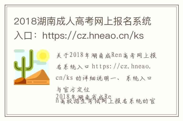 2018年湖南省成Ren高校招生考试网上报名系统的官方登录网址为 http://chengzhao.hneao.cn/ks 。该网站是当年湖南省教育考试院指定的唯一官方报名平台,所有考生均需通过此系统进行网上注册、信息填报、预约现场确认点及查询考试相关信息 。