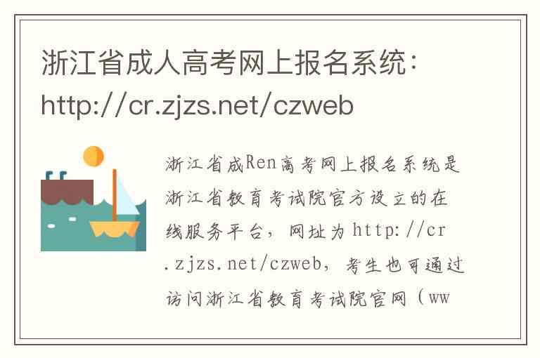 浙江省成Ren高考网上报名系统是浙江省教育考试院官方设立的在线服务平台,网址为 http://cr.zjzs.net/czweb,考生也可通过访问浙江省教育考试院官网(www.zjzs.net)进入该系统。该系统主要为参加浙江省成Ren高校招生考试的考生提供全流程的线上服务,涵盖网上报名、志愿填报、信息审核、网上缴费以及考后志愿确认等核心功能。