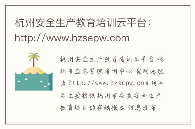 杭州安全生产教育培训云平台 杭州市应急管理培训中心 官网地址为 http://www.hzsapw.com 该平台主要提供杭州市各类安全生产教育培训的在线报名 信息发布 网络学习及相关服务