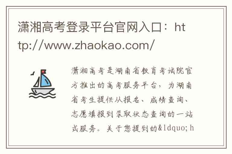 潇湘高考是湖南省教育考试院官方推出的高考服务平台,为湖南省考生提供从报名、成绩查询、志愿填报到录取状态查询的一站式服务。关于您提到的“http://www.zhaokao.com”网址,经过核实,该地址并非湖南省官方指定的“潇湘高考”平台登录入口。湖南省官方指定的“潇湘高考”相关平台入口、服务内容和联系方式如下