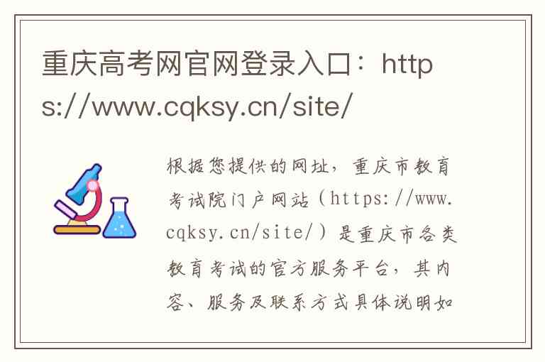 根据您提供的网址,重庆市教育考试院门户网站(https://www.cqksy.cn/site/)是重庆市各类教育考试的官方服务平台,其内容、服务及联系方式具体说明如下:
