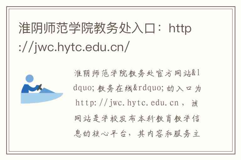 淮阴师范学院教务处官方网站“教务在线”的入口为 http://jwc.hytc.edu.cn ,该网站是学校发布本科教育教学信息的核心平台,其内容和服务主要如下: