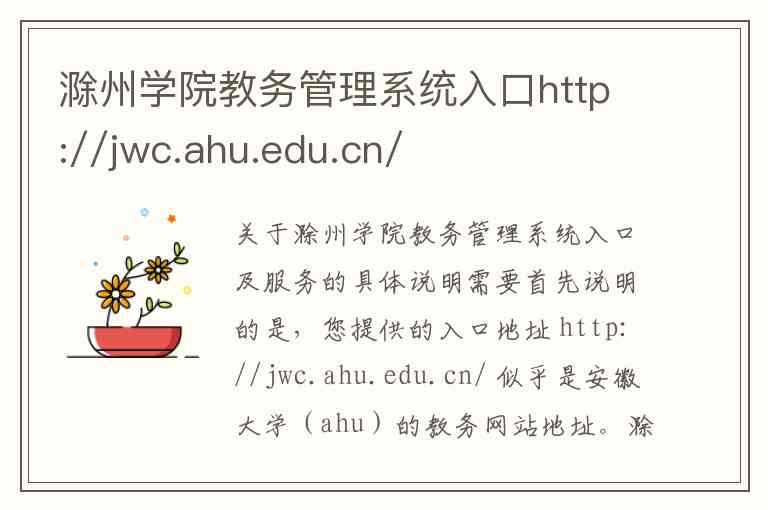 需要首先说明的是,您提供的入口地址 http://jwc.ahu.edu.cn/ 似乎是安徽大学(ahu)的教务网站地址。滁州学院教务管理系统的正确官方入口及相关信息服务如下。