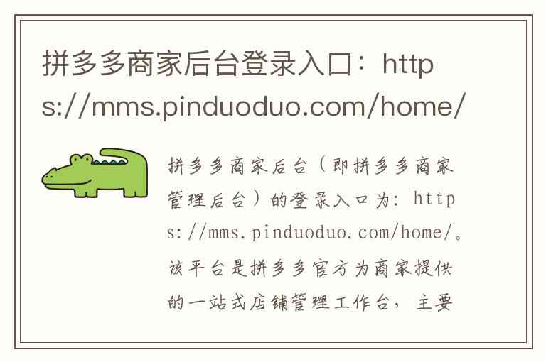 拼多多商家后台(即拼多多商家管理后台)的登录入口为:https://mms.pinduoduo.com/home/。该平台是拼多多官方为商家提供的一站式店铺管理工作台,主要涵盖以下内容和服务: