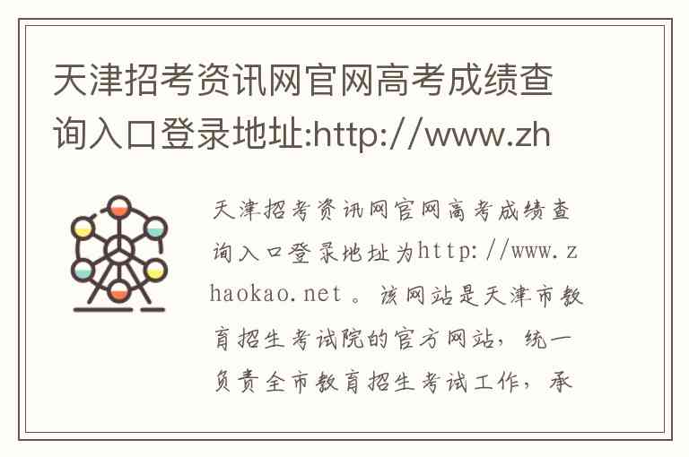 天津招考资讯网官网高考成绩查询入口登录地址为http://www.zhaokao.net 。该网站是天津市教育招生考试院的官方网站,统一负责全市教育招生考试工作,承担各类教育考试的开发、设计与实施,以及教育质量监测与评价等工作 。