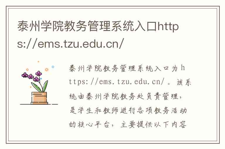 泰州学院教务管理系统入口为 https://ems.tzu.edu.cn/ 。该系统由泰州学院教务处负责管理,是学生和教师进行各项教务活动的核心平台,主要提供以下内容和服务: