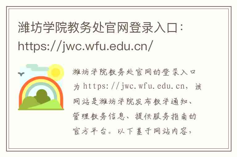 潍坊学院教务处官网的登录入口为 https://jwc.wfu.edu.cn,该网站是潍坊学院发布教学通知、管理教务信息、提供服务指南的官方平台。以下基于网站内容,对其主要功能模块和服务信息进行说明,并附上详细的联系方式和地址。