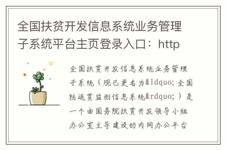 全国扶贫开发信息系统业务管理子系统(现已更名为“全国防返贫监测信息系统”)是一个由国务院扶贫开发领导小组办公室主导建设的内网办公平台。该系统主要用于各级扶贫工作人员进行内部数据管理、动态监测和业务审批,通常不对公众直接开放注册。以下是基于公开资料整理的关于该系统的内容、服务及相关联系信息: