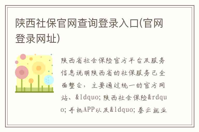 陕西省的社保服务已全面整合,主要通过统一的官方网站、“陕西社会保险”手机APP以及“秦云就业”小程序等渠道提供线上服务。以下是具体的官方登录入口、服务内容及联系方式: