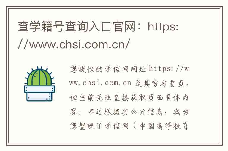 您提供的学信网网址 https://www.chsi.com.cn 是其官方首页,但当前无法直接获取页面具体内容。不过根据其公开信息,我为您整理了学信网(中国高等教育学生信息网)的详细情况、核心服务及官方联系方式。