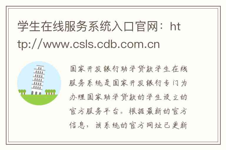国家开发银行助学贷款学生在线服务系统是国家开发银行专门为办理国家助学贷款的学生设立的官方服务平台。根据最新的官方信息,该系统的官方网址已更新为 https://sls.cdb.com.cn ,您也可以访问 http://www.csls.cdb.com.cn ,后者通常会跳转至新地址。