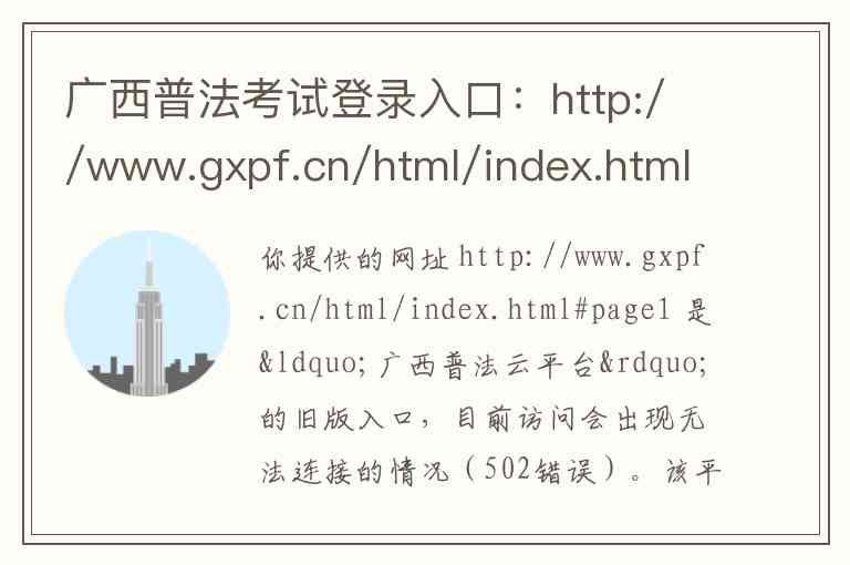 你提供的网址 http://www.gxpf.cn/html/index.html#page1 是“广西普法云平台”的旧版入口,目前访问会出现无法连接的情况(502错误)。该平台已进行升级和迁移,新的官方平台为“广西国家工作人员学法用法考试平台”及“广西普法网”,主要服务于全区的学法用法考试。