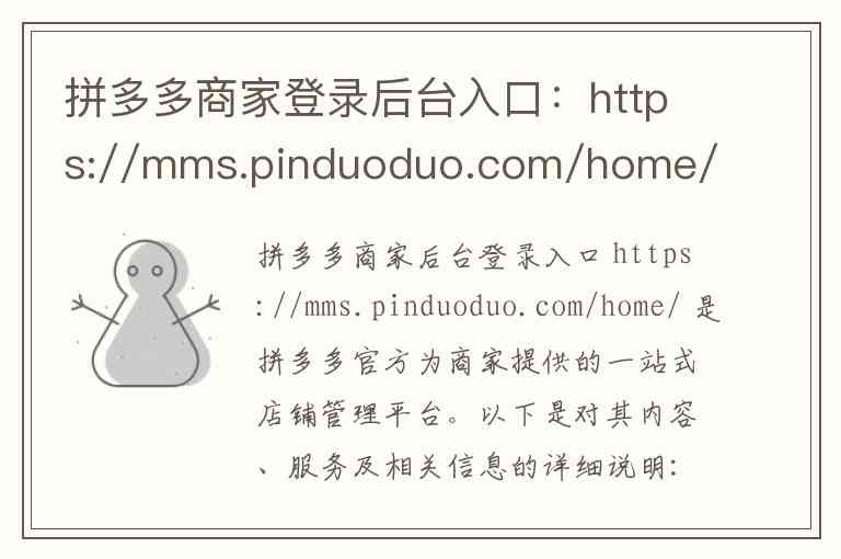 拼多多商家后台登录入口 https://mms.pinduoduo.com/home/ 是拼多多官方为商家提供的一站式店铺管理平台。以下是对其内容、服务及相关信息的详细说明: