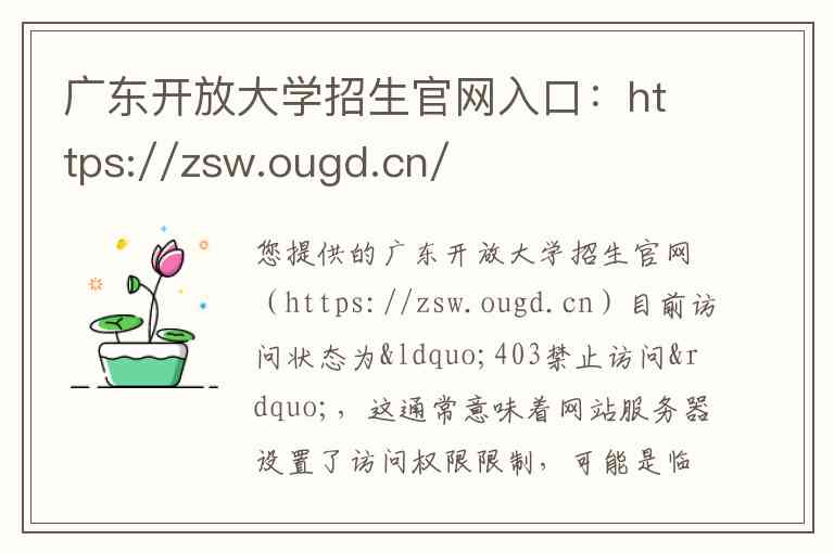 您提供的广东开放大学招生官网(https://zsw.ougd.cn)目前访问状态为“403禁止访问”,这通常意味着网站服务器设置了访问权限限制,可能是临时性的技术问题,或网站已迁移至新地址。