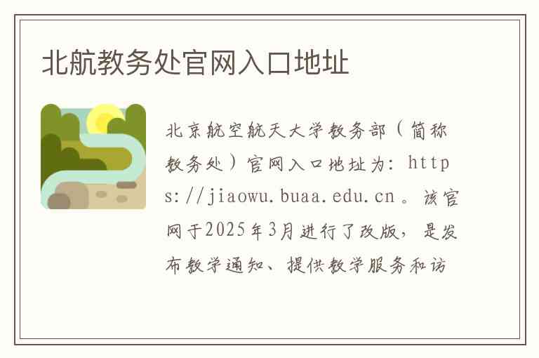 北京航空航天大学教务部(简称教务处)官网入口地址为:https://jiaowu.buaa.edu.cn 。