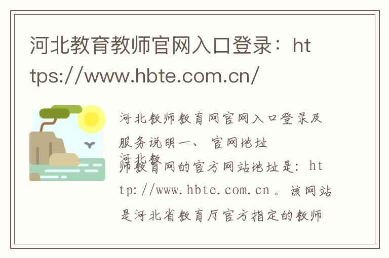 河北教师教育网的官方网站地址是:http://www.hbte.com.cn 。该网站是河北省教育厅官方指定的教师管理服务平台,也是河北省特岗教师招聘的唯一报考网站 。