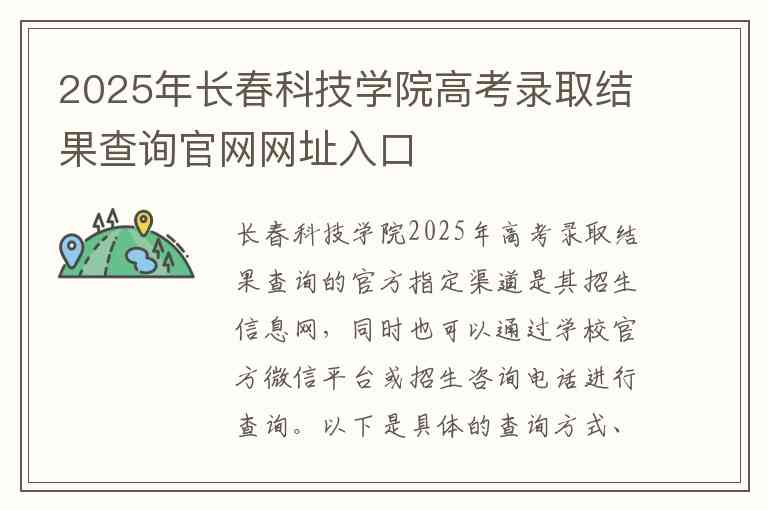 长春科技学院2025年高考录取结果查询的官方指定渠道是其招生信息网,同时也可以通过学校官方微信平台或招生咨询电话进行查询。