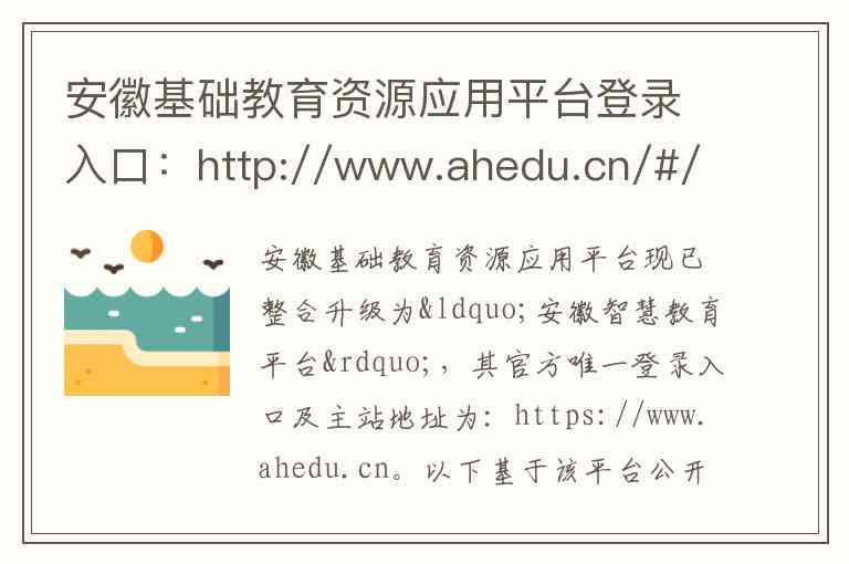 安徽基础教育资源应用平台现已整合升级为“安徽智慧教育平台”,其官方唯一登录入口及主站地址为:https://www.ahedu.cn。以下基于该平台公开信息,为您详细说明其内容、服务及联系方式。