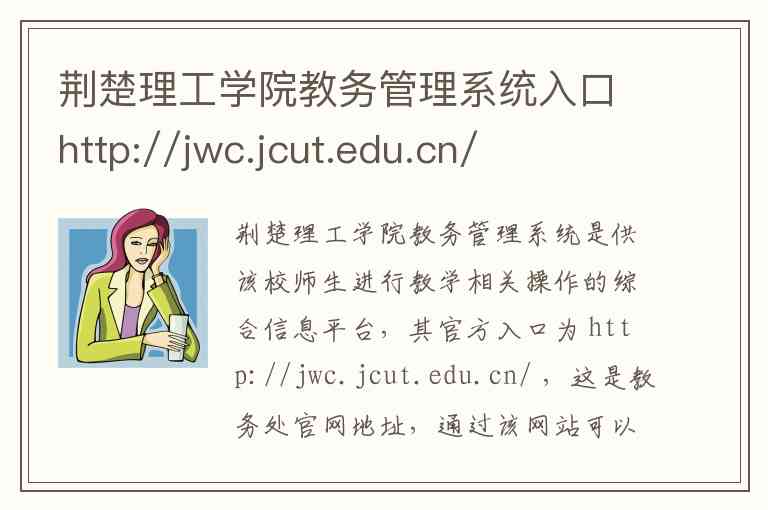 荆楚理工学院教务管理系统是供该校师生进行教学相关操作的综合信息平台,其官方入口为 http://jwc.jcut.edu.cn/ ,这是教务处官网地址,通过该网站可以跳转至具体的教务系统。