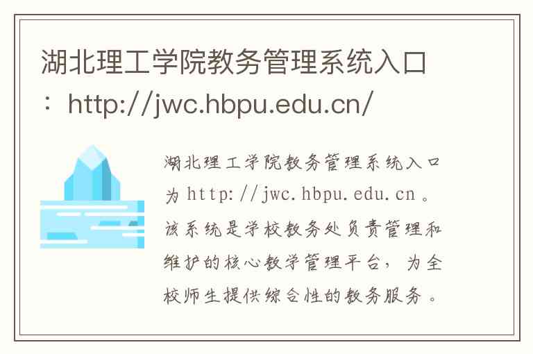 湖北理工学院教务管理系统入口为 http://jwc.hbpu.edu.cn 。该系统是学校教务处负责管理和维护的核心教学管理平台,为全校师生提供综合性的教务服务 。