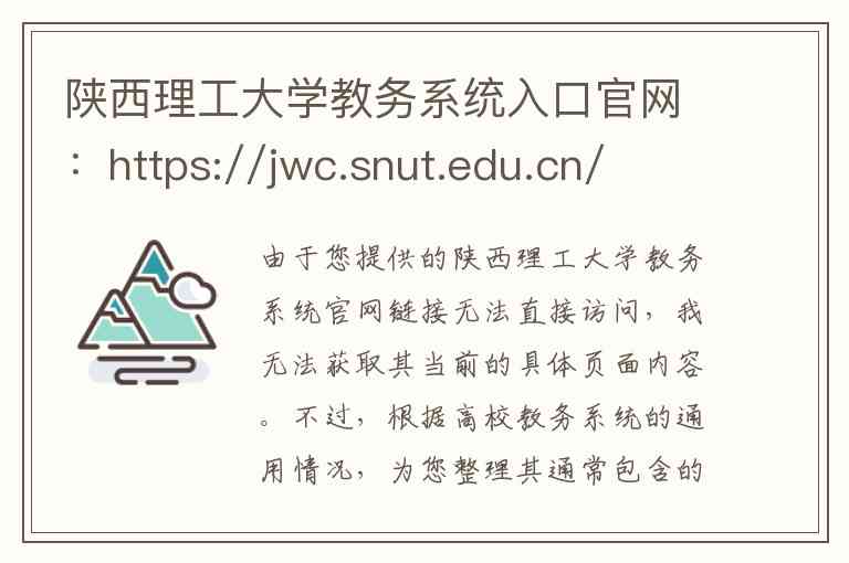 由于您提供的陕西理工大学教务系统官网链接无法直接访问,我无法获取其当前的具体页面内容。不过,根据高校教务系统的通用情况,为您整理其通常包含的服务模块、核心功能以及获取准确联系方式的方法。