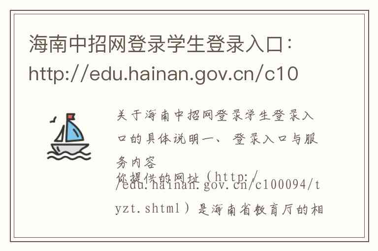 你提供的网址(http://edu.hainan.gov.cn/c100094/tyzt.shtml)是海南省教育厅的相关页面,但实际的海南中招管理系统考生登录入口需要通过海南省考试局官网进入。具体的登录路径和操作流程如下: