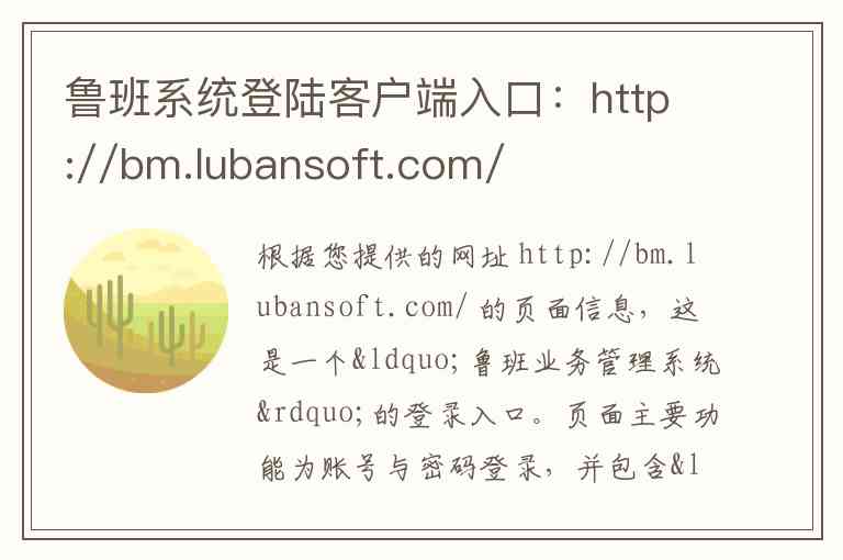 根据您提供的网址 http://bm.lubansoft.com/ 的页面信息,这是一个“鲁班业务管理系统”的登录入口。页面主要功能为账号与密码登录,并包含“记住密码”的选项,未提供公开的详细介绍、服务内容、地址或联系方式。
