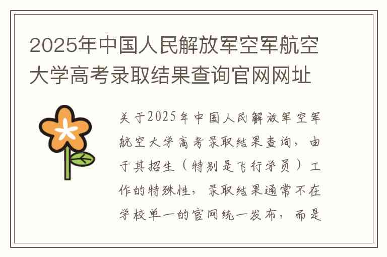 关于2025年中国人民解放军空军航空大学高考录取结果查询,由于其招生(特别是飞行学员)工作的特殊性,录取结果通常不在学校单一的官网统一发布,而是通过省级教育考试院、军队招飞部门以及学校官方渠道同步进行。
