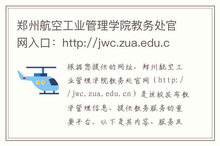 根据您提供的网址,郑州航空工业管理学院教务处官网(http://jwc.zua.edu.cn)是该校发布教学管理信息、提供教务服务的重要平台。以下是其内容、服务及联系方式的详细说明: