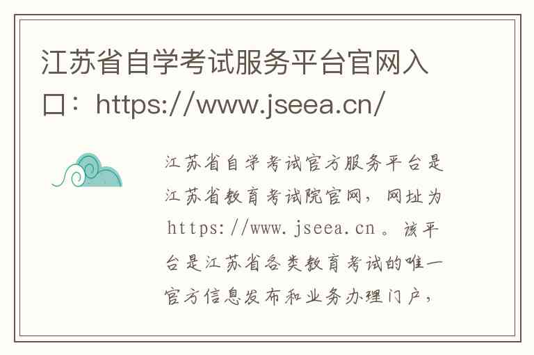 江苏省自学考试官方服务平台是江苏省教育考试院官网,网址为 https://www.jseea.cn 。该平台是江苏省各类教育考试的唯一官方信息发布和业务办理门户,为自学考试考生提供全流程服务。