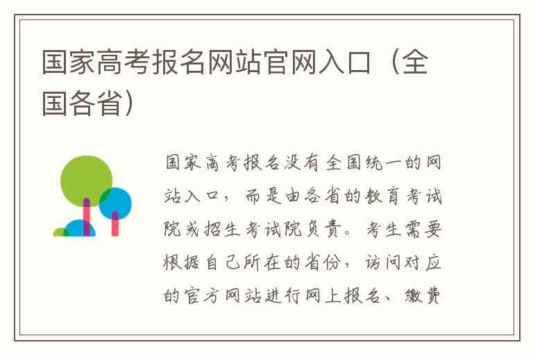 国家高考报名没有全国统一的网站入口,而是由各省的教育考试院或招生考试院负责。考生需要根据自己所在的省份,访问对应的官方网站进行网上报名、缴费、查询成绩和填报志愿。