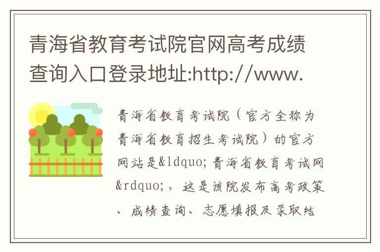青海省教育考试院(官方全称为青海省教育招生考试院)的官方网站是“青海省教育考试网”,这是该院发布高考政策、成绩查询、志愿填报及录取结果等信息的唯一官方渠道。