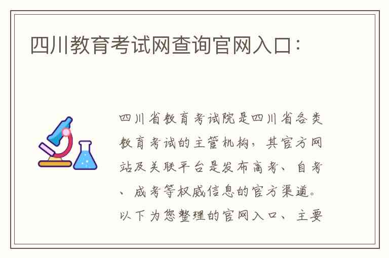 四川省教育考试院是四川省各类教育考试的主管机构,其官方网站及关联平台是发布高考、自考、成考等权威信息的官方渠道。以下为您整理的官网入口、主要服务内容及联系方式:
