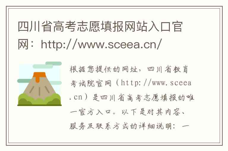 根据您提供的网址,四川省教育考试院官网(http://www.sceea.cn)是四川省高考志愿填报的唯一官方入口。以下是对其内容、服务及联系方式的详细说明: