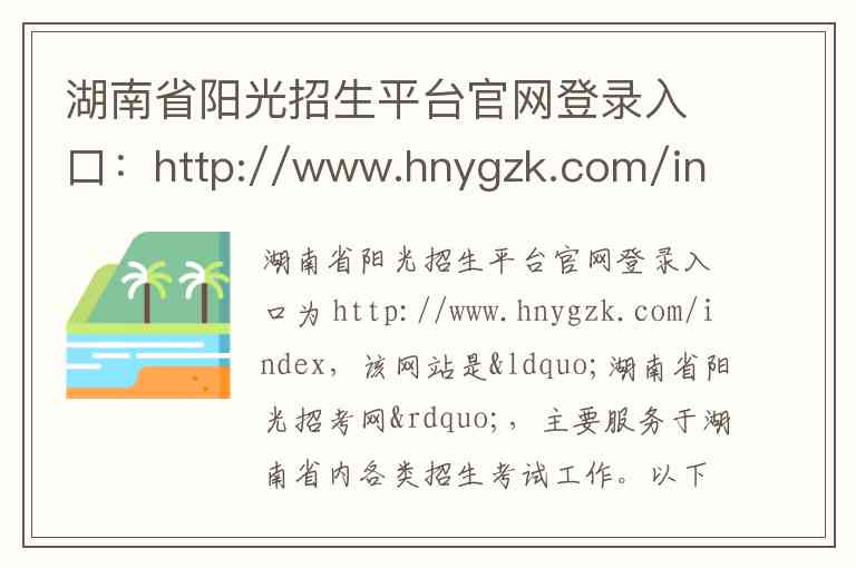 湖南省阳光招生平台官网登录入口为 http://www.hnygzk.com/index,该网站是“湖南省阳光招考网”,主要服务于湖南省内各类招生考试工作。以下是对其内容、服务及联系方式的详细说明: