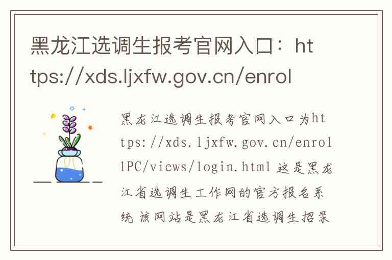黑龙江选调生报考官网入口为https://xds.ljxfw.gov.cn/enrollPC/views/login.html 这是黑龙江省选调生工作网的官方报名系统 该网站是黑龙江省选调生招录的唯一官方平台 涵盖了从公告发布到录用的全流程服务