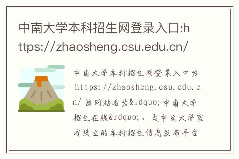 中南大学本科招生网登录入口为 https://zhaosheng.csu.edu.cn/ 该网站名为“中南大学招生在线”,是中南大学官方设立的本科招生信息发布平台,旨在为考生提供全面的招生政策、报考指南及录取信息查询服务。