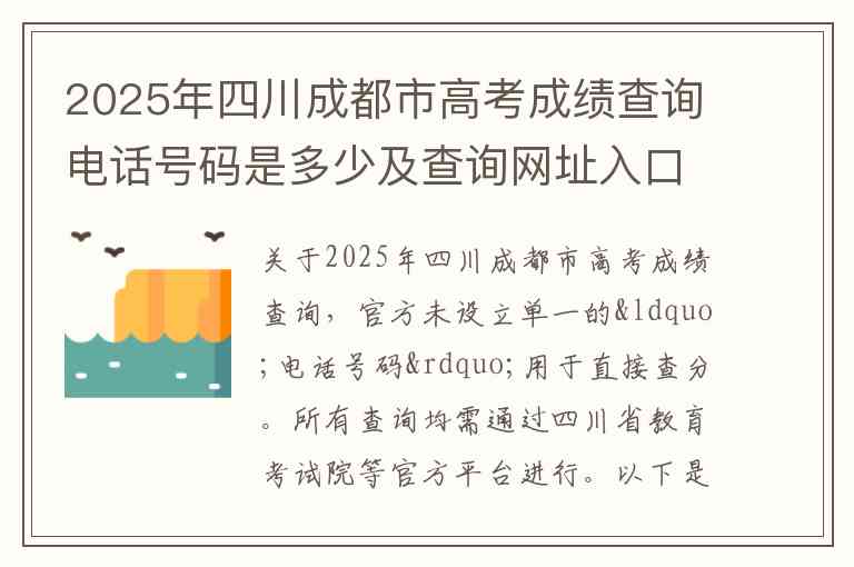 关于2025年四川成都市高考成绩查询,官方未设立单一的“电话号码”用于直接查分。所有查询均需通过四川省教育考试院等官方平台进行。以下是基于四川省教育考试院发布信息的详细说明: