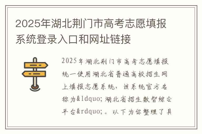 2025年湖北荆门市高考志愿填报统一使用湖北省普通高校招生网上填报志愿系统,该系统官方名称为“湖北省招生数智综合平台”。以下为你整理了具体的登录入口、服务内容、时间安排以及官方联系方式。