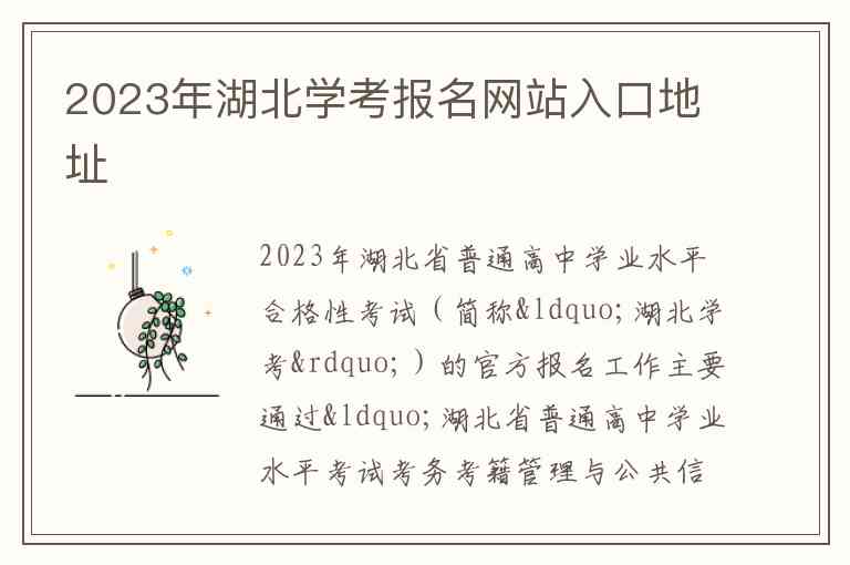 2023年湖北省普通高中学业水平合格性考试(简称“湖北学考”)的官方报名工作主要通过“湖北省普通高中学业水平考试考务考籍管理与公共信息服务平台”(简称“学考信息平台”)进行,该平台的登录入口部署在湖北省教育考试院官网。