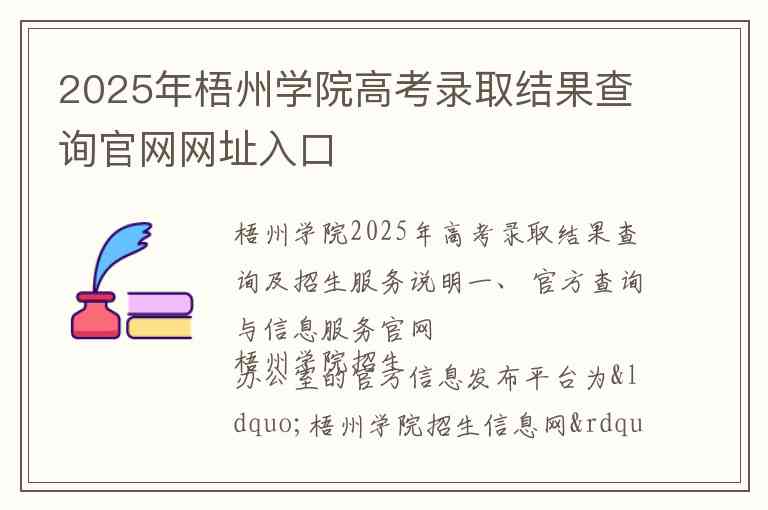 梧州学院招生办公室的官方信息发布平台为“梧州学院招生信息网”,2025年的高考录取结果、招生政策、历年分数及最新通知均会在此网站首发。