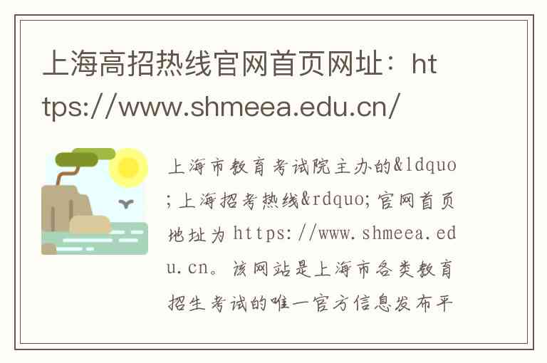 上海市教育考试院主办的“上海招考热线”官网首页地址为 https://www.shmeea.edu.cn。该网站是上海市各类教育招生考试的唯一官方信息发布平台,其具体内容、服务及联系方式如下: