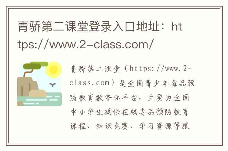 青骄第二课堂(https://www.2-class.com)是全国青少年毒品预防教育数字化平台,主要为全国中小学生提供在线毒品预防教育课程、知识竞赛、学习资源等服务。以下是其内容、服务及联系方式的详细说明: