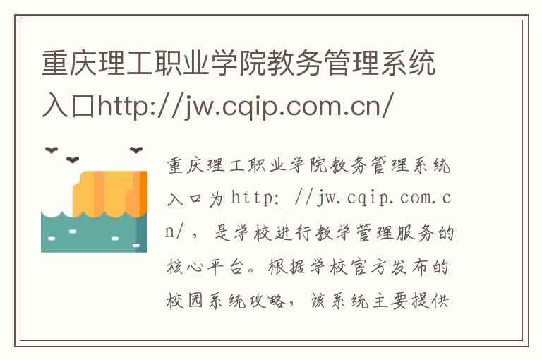 重庆理工职业学院教务管理系统入口为 http://jw.cqip.com.cn/ ,是学校进行教学管理服务的核心平台。根据学校官方发布的校园系统攻略,该系统主要提供以下内容和服务: