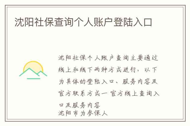 沈阳社保个人账户查询主要通过线上和线下两种方式进行,以下为具体的登陆入口、服务内容及官方联系方式