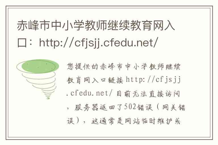 您提供的赤峰市中小学教师继续教育网入口链接 http://cfjsjj.cfedu.net/ 目前无法直接访问,服务器返回了502错误(网关错误),这通常是网站临时维护或服务器问题。因此,我无法基于该页面内容为您说明其具体服务。但根据赤峰市教师继续教育的常规情况,为您整理了以下参考信息: