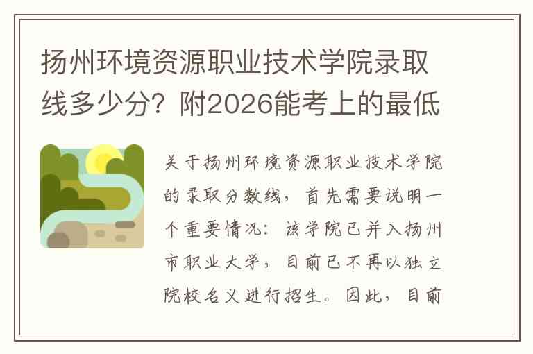 关于扬州环境资源职业技术学院的录取分数线,首先需要说明一个重要情况:该学院已并入扬州市职业大学,目前已不再以独立院校名义进行招生。