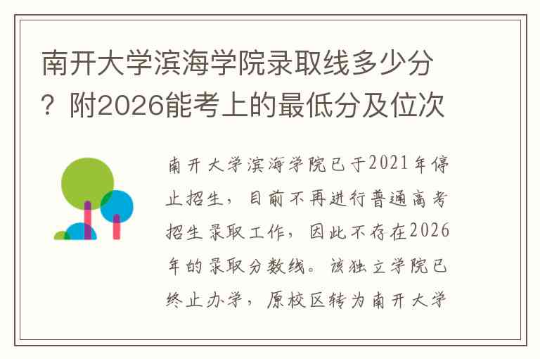 南开大学滨海学院已于2021年停止招生,目前不再进行普通高考招生录取工作,因此不存在2026年的录取分数线。