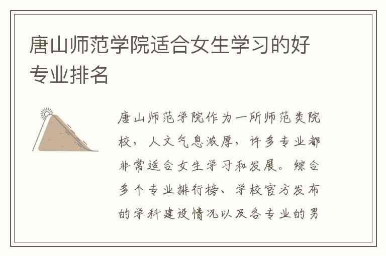 唐山师范学院作为一所师范类院校,人文气息浓厚,许多专业都非常适合女生学习和发展。综合多个专业排行榜、学校官方发布的学科建设情况以及各专业的男女比例和就业前景,以下为你整理该校适合女生学习的优势专业排名: